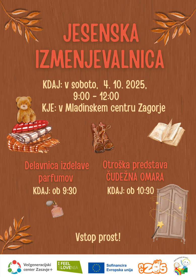 Vabimo vas, da se nam pridružite v soboto, 4. oktobra 2025, med 9.00 in 12.00 na Mladinskem centru Zagorje, kjer bo potekala Jesenska izmenjevalnica.