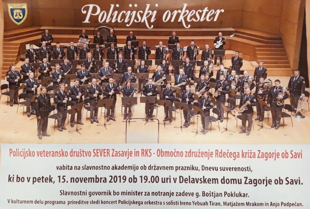 Policijsko veteransko društvo SEVER Zasavje in RKS - Območno združenje Rdečega križa Zagorje ob Savi vabita na slavnostno akademijo ob državnem prazniku, Dnevu suverenosti, ki bo v petek, 15. novembra 2019, ob 19:00 uri v Kulturnem centru Delavski dom Zagorje ob Savi.