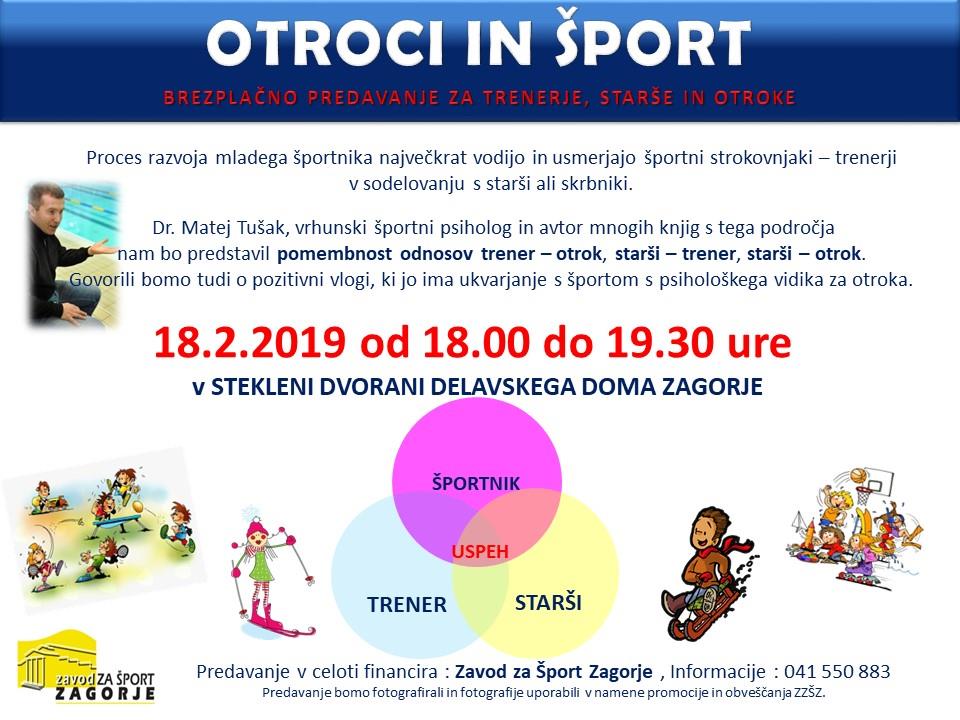 Če si trener, športnik, športni delavec, starš ali samo športni podpornik, vsekakor ne smeš zamuditi predavanja, ki ga organizira Zavod za Šport Zagorje na temo OTROCI in ŠPORT. Predavatelj dr. Matej Tušak bo predstavil pomembnost odnosov trener – otrok, starši – trener, starši – otrok, kako te vloge med seboj najboljše izpeljati in povezovati, kajti le dobri odnosi dajejo najboljše rezultate. Govorili bomo tudi o pozitivni vlogi, ki jo ima ukvarjanje s športom s psihološkega vidika za otroka.