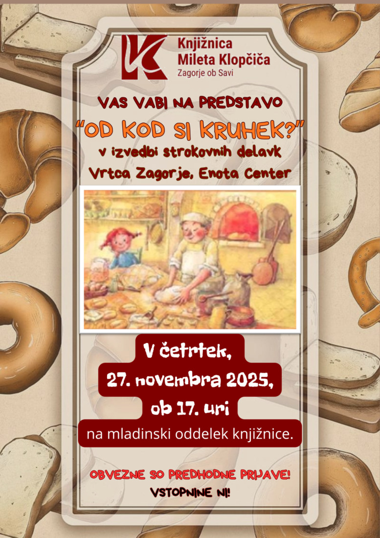 Starši in otroci, vabimo vas na čudovito otroško predstavo z naslovom Od kod si kruhek?, ki jo bodo izvedle strokovne delavke iz Vrtca Zagorje, Enota Center. Predstava Od kod si kruhek? je poučna in zabavna zgodba, ki otroke popelje na potovanje, kjer bodo spoznali, kako iz pšeničnih zrn nastane njihov najljubši kruhek.
